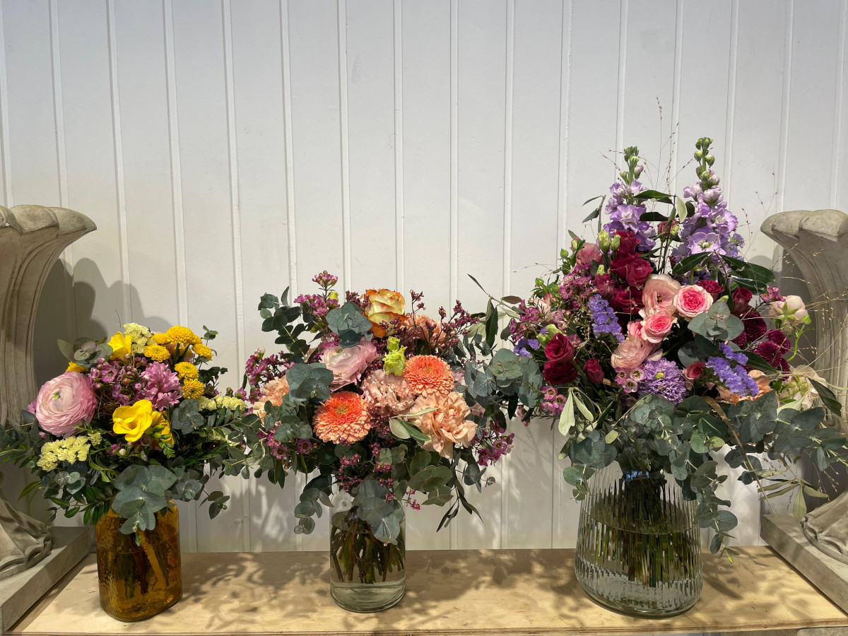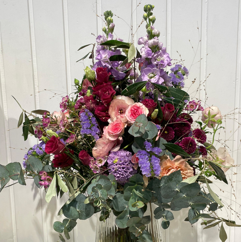 flieder, rosé, pink gehalten, bestehend aus Levkoje, Lysianthus, Polyantharosen, Statice, Nelken und Santini, aufgelockert mit Trockengräsern, Olive und Eucalyptus