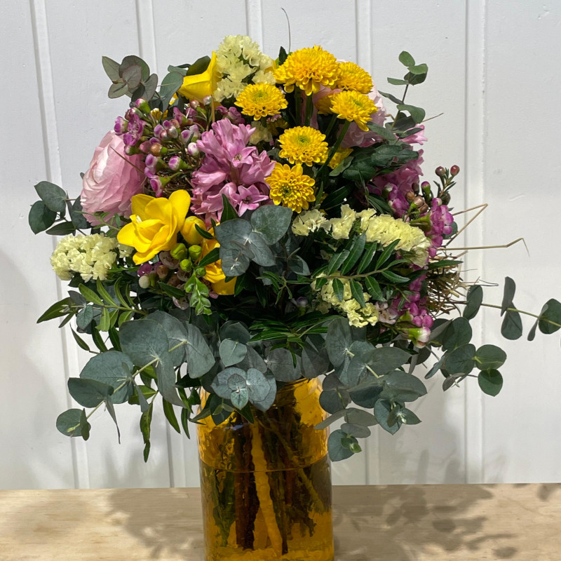 gelb rosa gehalten, bestehend aus Rankunkeln, Hyacinthen, Freesien, Statice, Santini und Waxflower, aufgelockert mit Heu und Eucalyptus